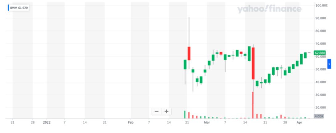 每股收益: Blue Water 疫苗的 EPS 目前為 -1.01,而 Moderna 的 EPS 為 28.29。 BWV 沒有可用的市盈率,管理層也沒有宣布任何股息,這也是可以理解的,因為公司沒有產生任何收入。 下圖取自雅虎財經,顯示了 BWV 過去三年的股價表現,表明他的股價正在上漲。因此,投資這家公司可能是一個不錯的選擇。 概括: 生物技術研究和投資於生物技術研究的公司是未來,因為在未來幾年,世界將繼續面臨不同類型的挑戰。為了使他們生存下來,正在進行重大的研究工作,投資者應該投資並幫助這些公司成長。像藍水疫苗這樣的公司正在開發重要的藥物。我們還有 Moderna 的例子,它也遭受了重大損失,但一旦他們研製出疫苗並能夠出售它就能夠賺取收入。藍水疫苗除外。