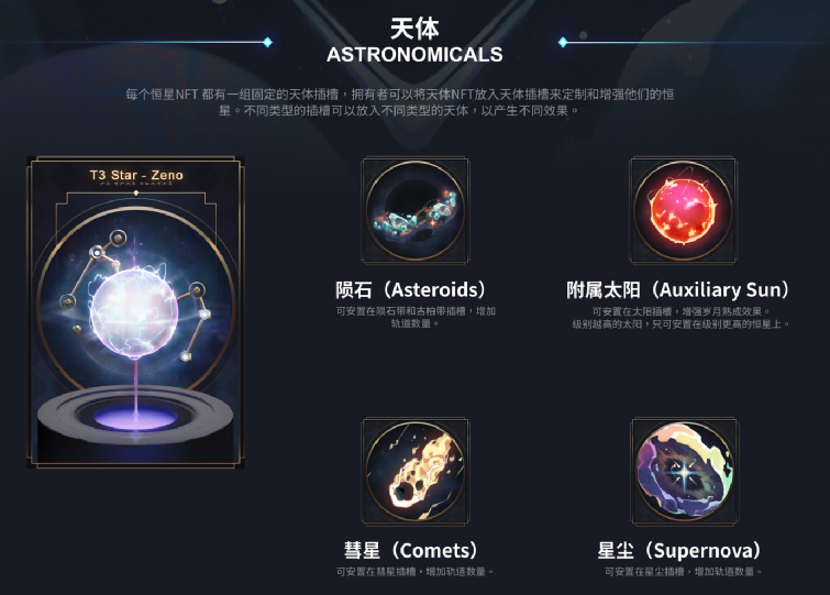 3、恒星作为土地还有提升空间,因为是可定制的。通过安置陨石、彗星、星尘等天体NFT,可增加更多轨道数量;安置太阳可再加快行星成长速度。并且既然是定制,那么外观上也会有所不同。例如安装了三个陨石的恒星,和安装了两个陨石、一个太阳的恒星外观就会有差异。
