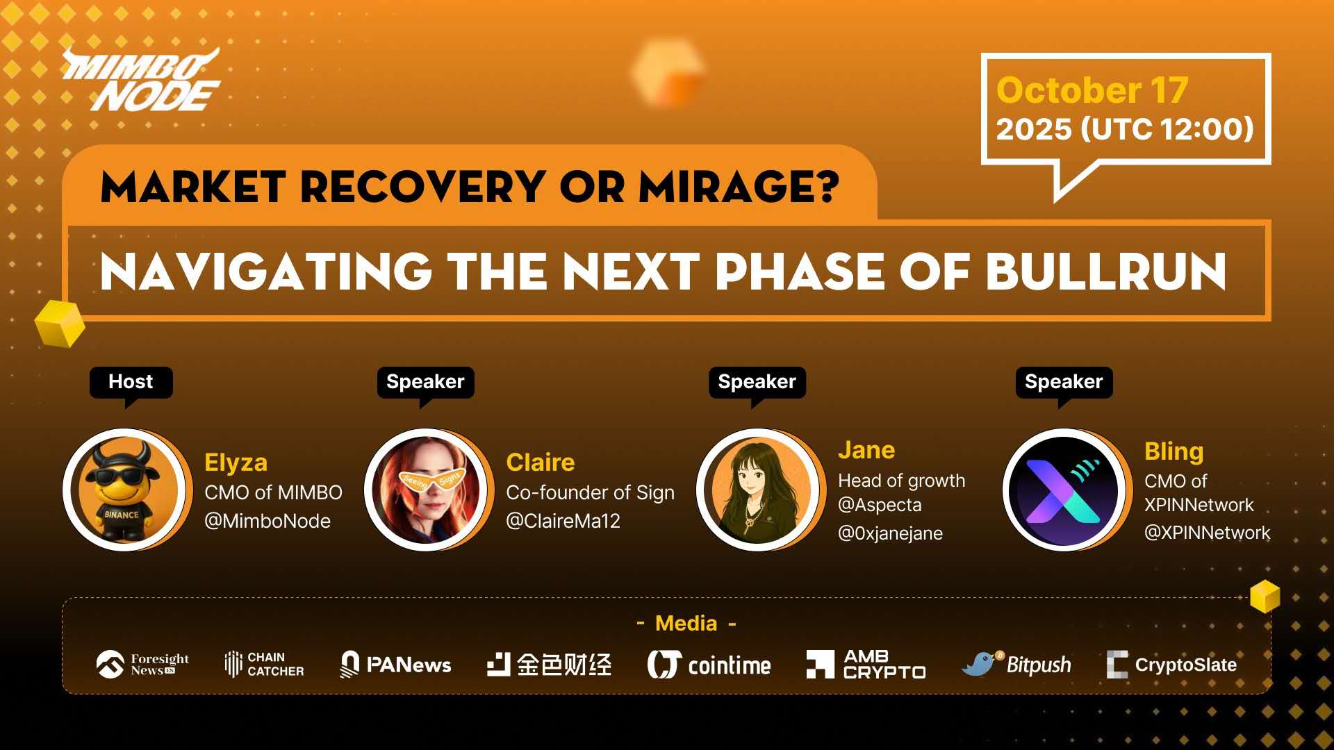 在此背景下,MIMBO Node (MGG) 于 2025 年 10 月 17 日主办了主题为「Market Recovery or Mirage? Navigating the Next Phase of Bull Run」的 X Space,邀请了已在 Binance、Bybit、KuCoin、Gate.io 等全球主流交易所上市的项目 Sign、XPIN Network 和 Aspecta 核心负责人,共同探讨了当前的市场格局、未来叙事以及建设者的生存之道。